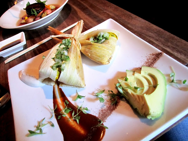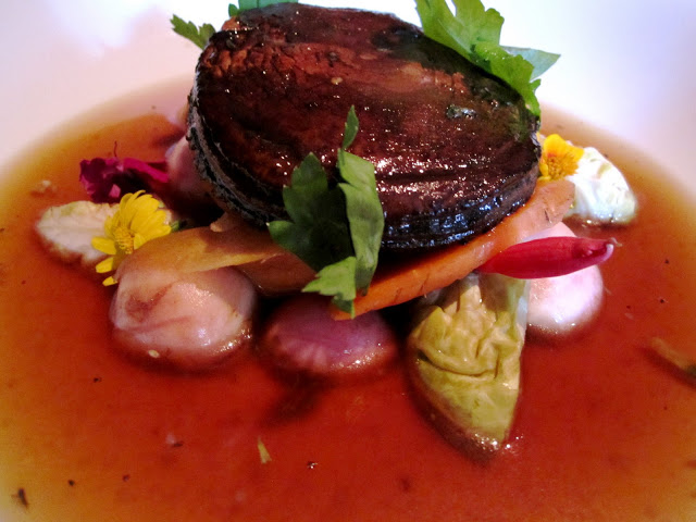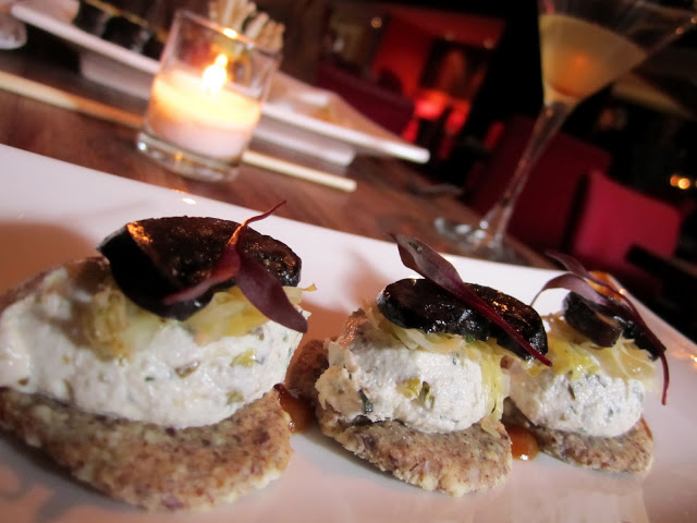 Pure Food and Wine serves raw, organic, vegan fare and for appetizers we had these cute Hazelnut Crostinis with Crimini Mushrooms and Caper Bearnaise, caraway sauerkraut and local apple cider reduction. Yummy!