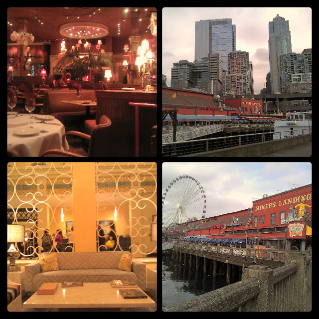 | From top left: pleather jacket was warm enough to be worn in this hometown of grunge, Experience Music Project got me close up and personal with Nirvana and Jimi Hendrix, great lunch at Veggie Grill, walking up to Capitol Hill. |