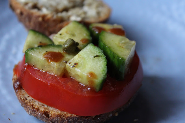 EAT! I love bread. My snack lately has been sprouted whole wheat and flax seed rolls with hummus, tomato, balsamic vinegar marinated cucumber, capris and some tabasco sprinkled on top (I’m addicted to hot sauce). Yum!