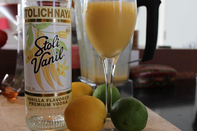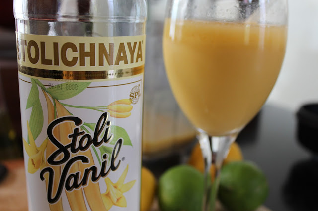 When I’m in a mood for a cocktail I try to use as natural ingredients as possible. Cocktail mixes or store bought juices definitely won’t cut it. It’s either blended fruits or lemon/lime juice. I was in a tropical mood and we had some mango pieces in the freezer so I decided to make mango smoothie with a splash of vanilla vodka. I mixed frozen mango with little bit of ice, fresh lemon juice and filtered water in the blender. If you need more sweetness you can use some honey, stevia or dates (add one or two dates in the high speed blender).