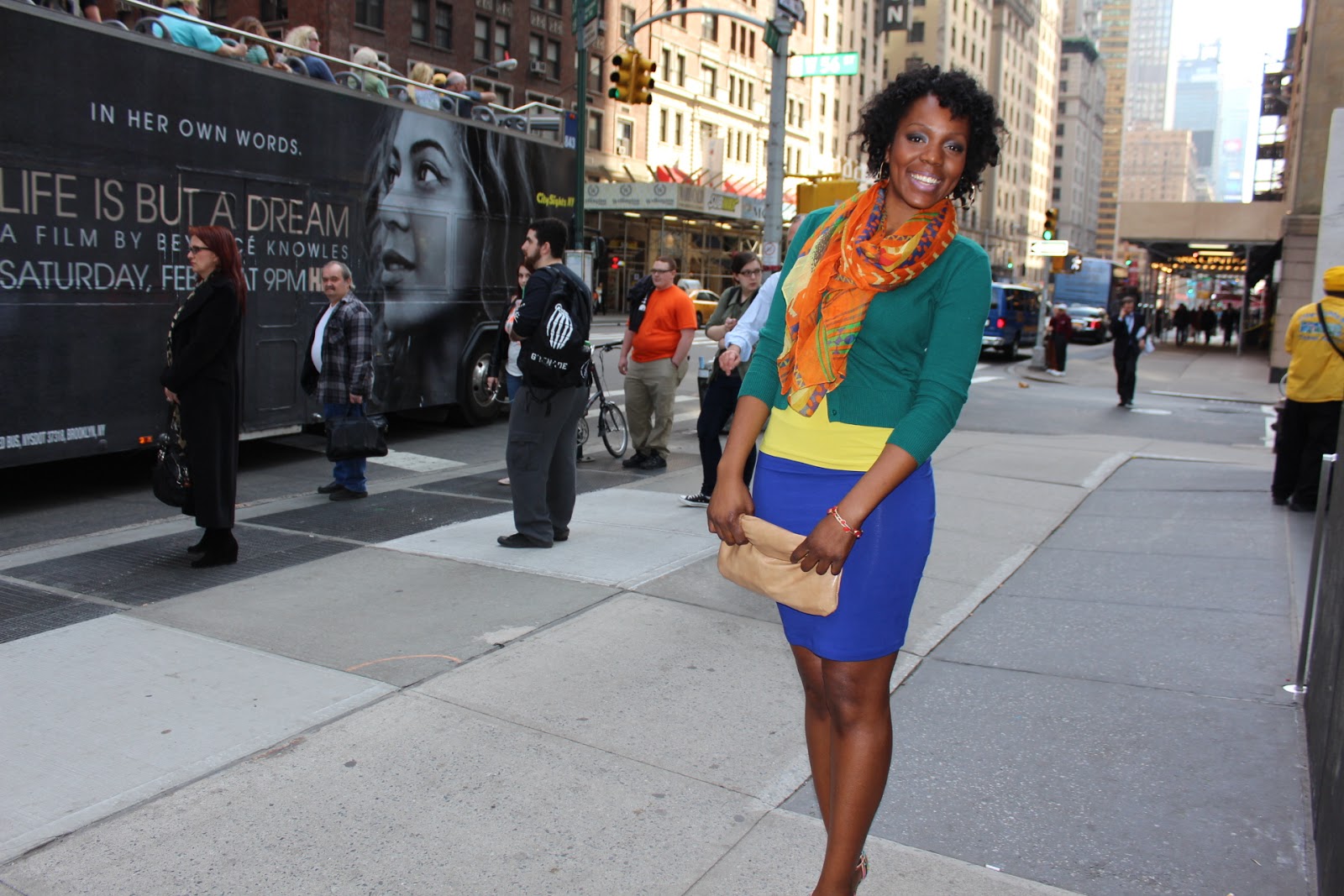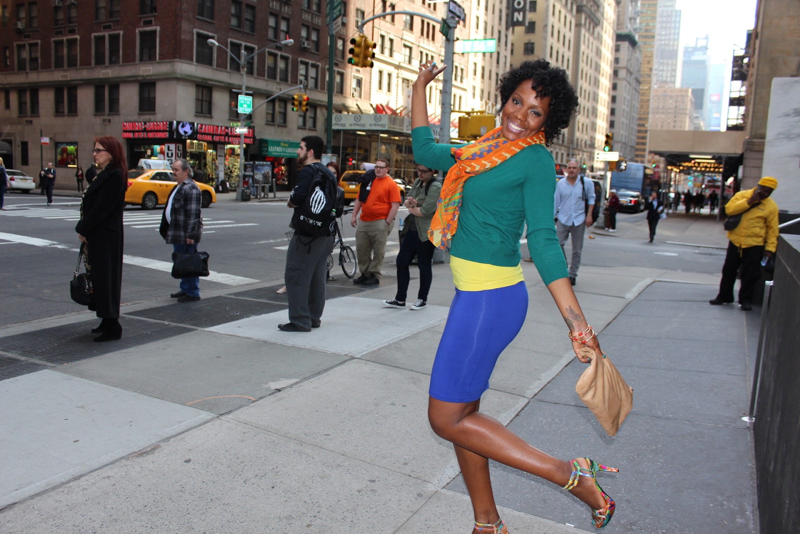 My gorgeous friend Keli agreed to be my model once again when we were rushing to a work related event so here are some shots from 56th St. and 7th Avenue in front of the Red Eye Grill. Love the bright colors to go with her cheery personality!