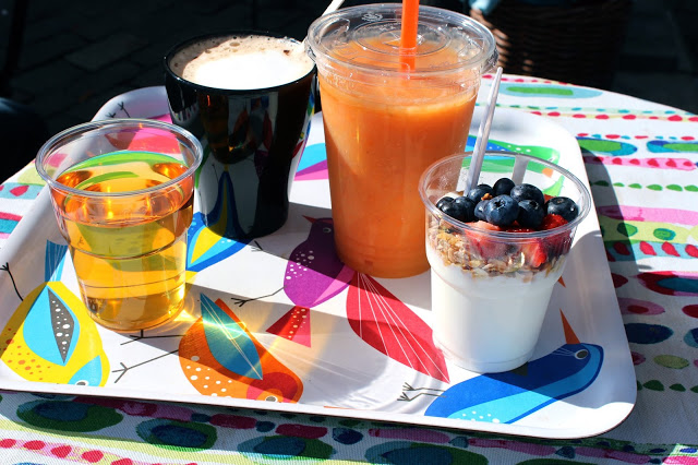 This is what you get for $10 breakfast at Koket: juice, soy mocha, smoothie and yogurt parfait. Cute little place. Loved their colorful trays and table cloths.