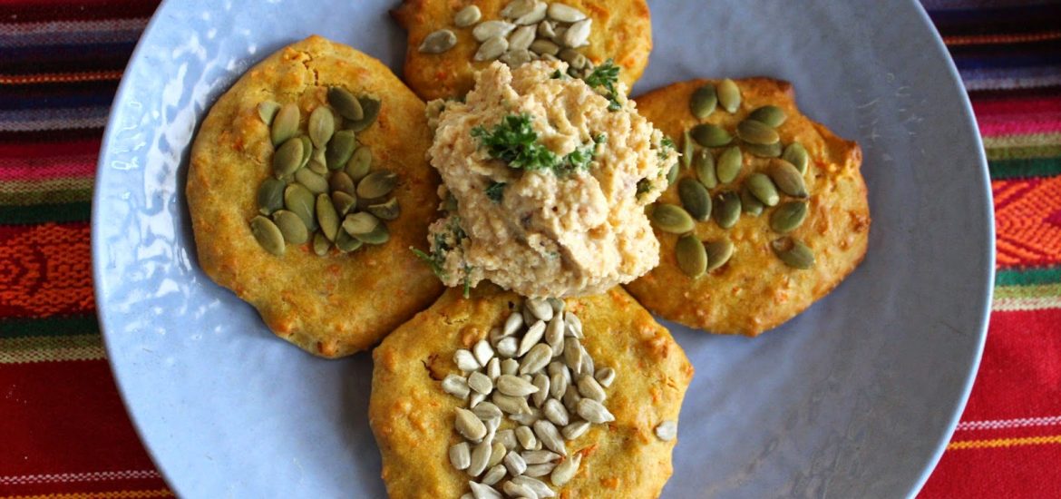 Combine all ingredients in a large bowl. Scoop onto a greased cookie sheet. Sprinkle seeds of your liking on top (I used pumpkin and sunflower seeds). Bake for about 20 minutes in 425°F. Serve warm with hummus. Recipe in Finnish here.
