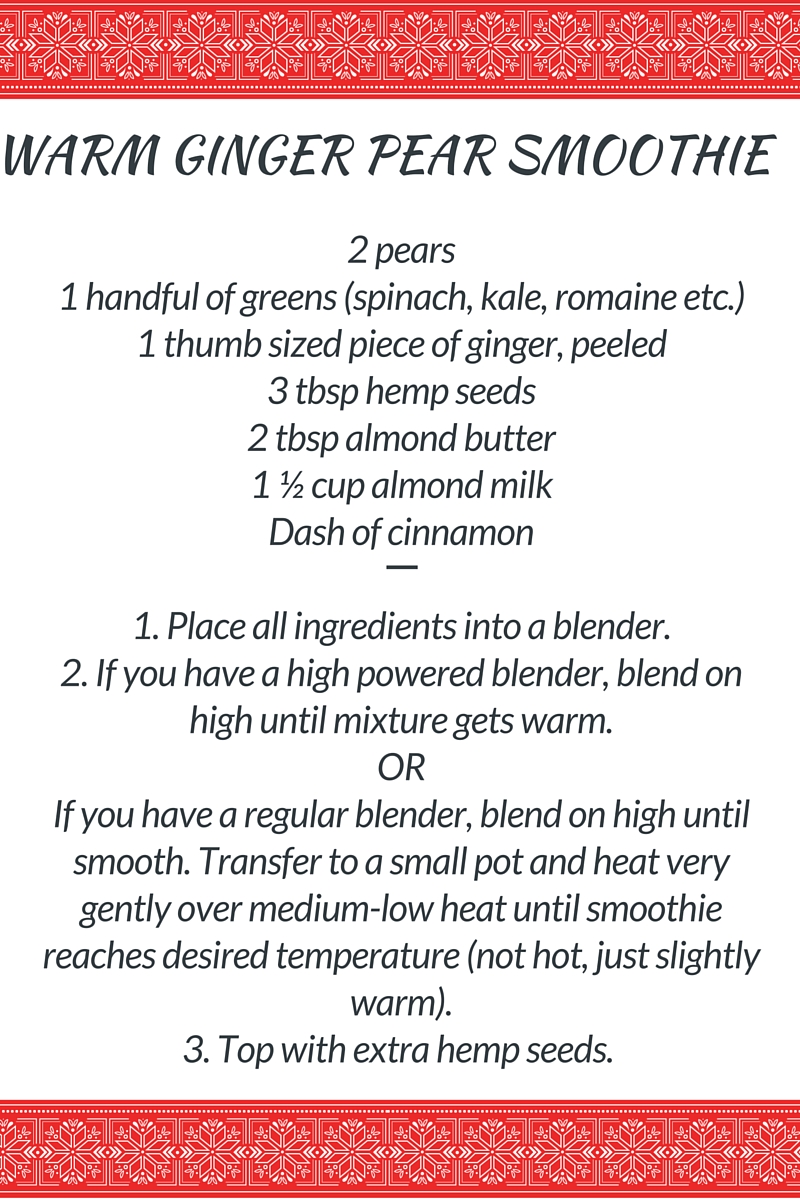 I prefer all my drinks room-temperature or warm (including water), probably because I’m Vata according to Ayurveda and almost always feeling cold rather than warm. I use lots of warming spices like cinnamon, cayenne, cardamon and turmeric (when cooking, in smoothies, as well as with my morning tea), but never thought to slightly warm up my smoothie before. You can also warm it up a little in your high-speed blender if you let it run a little longer and the motor of the machine starts warming it up. This recipe for Warm Ginger Pear Smoothie is great for breakfast or snack during the colder season.